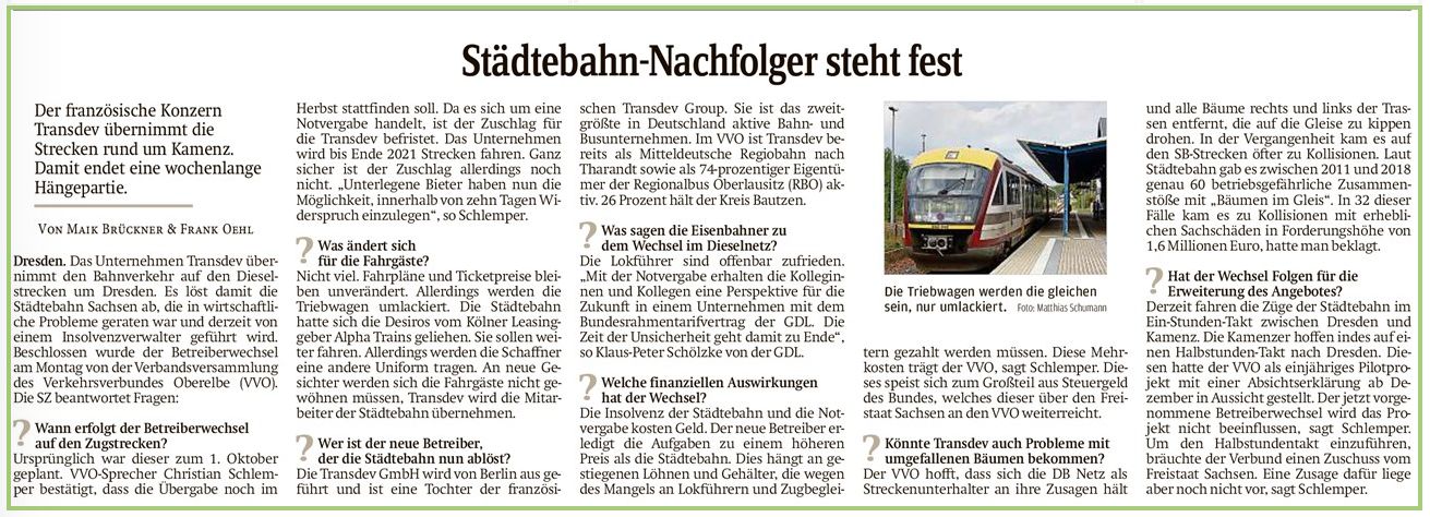 Am 16.09.2019 konnte man der Sächsischen Zeitung entnehmen, dass der Gewinner der Notvergabe durch den Verkehrsverbund Oberelbe die Transdev, ein Unternehmen aus Frankreich, ist. Der Name ist zwar relativ unbekannt, aber es ist schon seit vielen Jahren in unserer Gegend aktiv. So gehört ihm das Nahverkehrsunternehmen RVO beispielsweise zu 74%. Transdev möchte das komplette Personal der insolventen Städtebahn übernehmen, so dass der Reiseverkehr auf der Schiene wieder in ruhigeren und stabilen Verhältnissen fährt. Zumindest in den nächsten 2 Jahren, denn nur für diesen Zeitraum gilt wegen des Notvergabe-Verfahrens der Zuschlag des VVO.